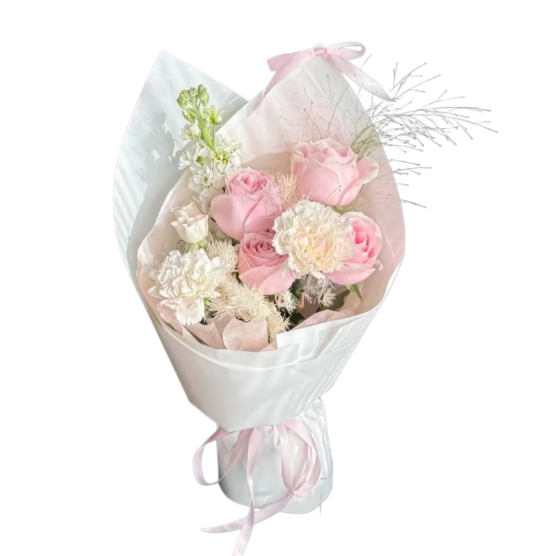 >人间花事 4朵粉雪山+2朵白康+白罗兰+折射+喷泉草+永生蓬莱松鲜花束(同城配送)