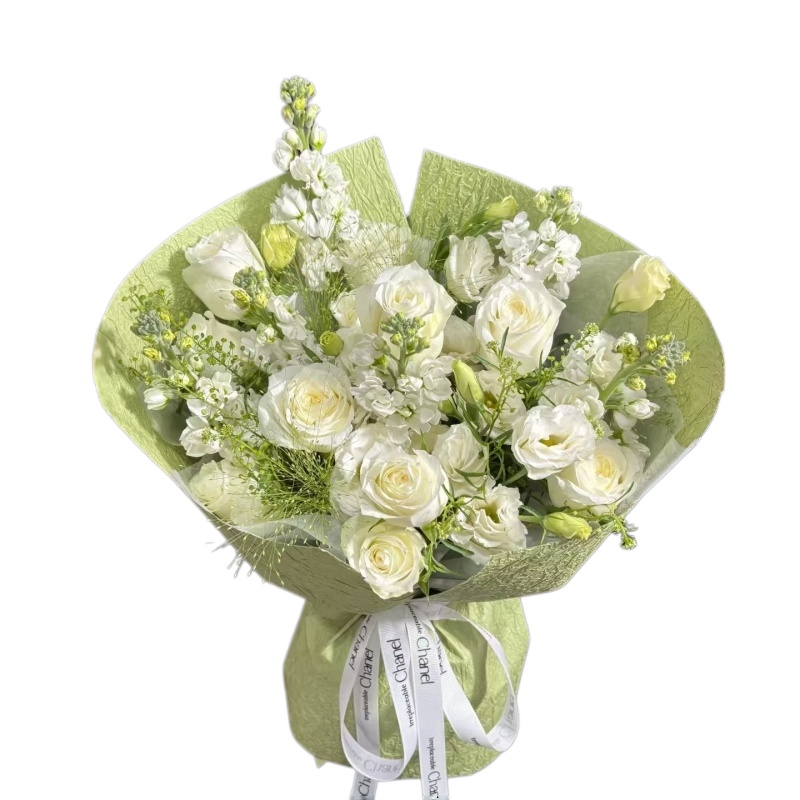 >青雾冷屿9朵白玫瑰+白桔梗+白罗兰+喷泉草+绿铃草鲜花束(同城配送)