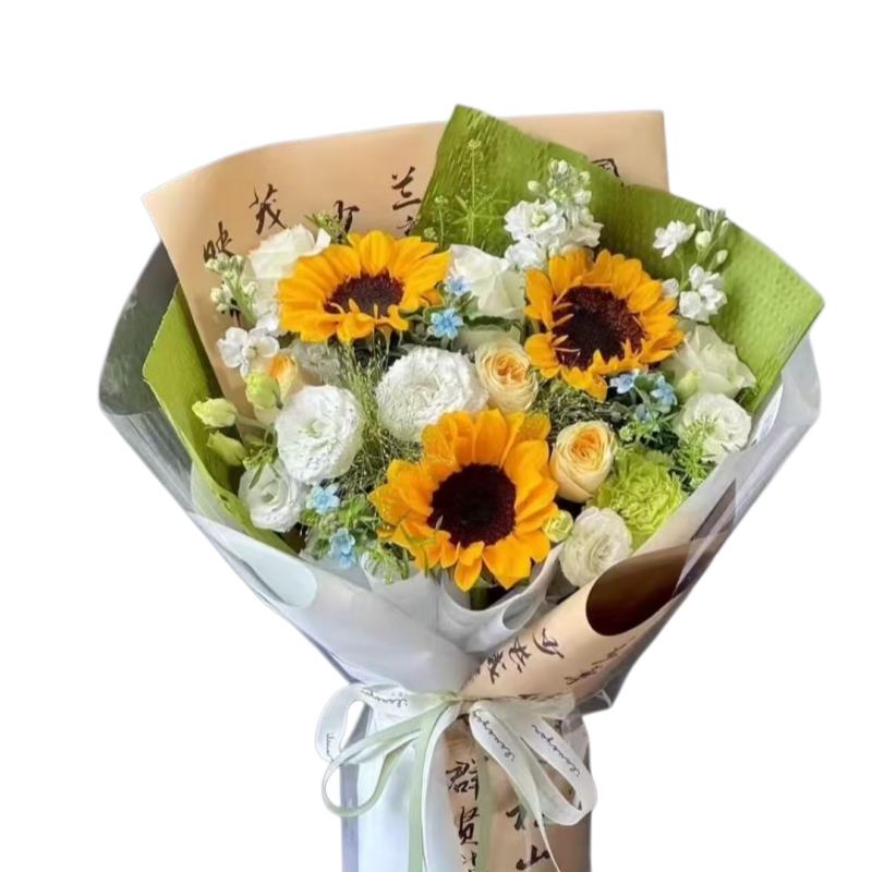>晴日限定3朵向日葵+3朵香槟+3朵白玫瑰+白桔梗+绿康+蓝星花+白罗兰+绿铃草+喷泉草鲜花束(同城配送)