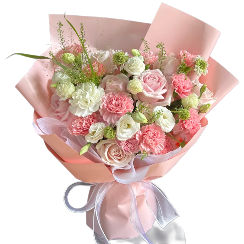 >爱意漫粉7朵粉雪山+11朵粉康+白康+白桔梗+绿铃草+喷泉草鲜花束(同城配送)