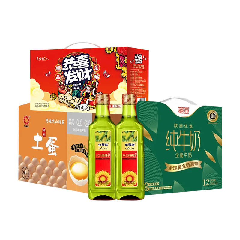 330套餐(贝蒂斯食用调和油(葵花橄榄)468ml*2礼盒+天地粮人甄制恭喜发财八种精品杂粮礼盒2.8kg+九珠30枚杂粮鸡蛋+德亚欧洲优选(黄金奶源带)全脂牛奶200ml*12礼盒)