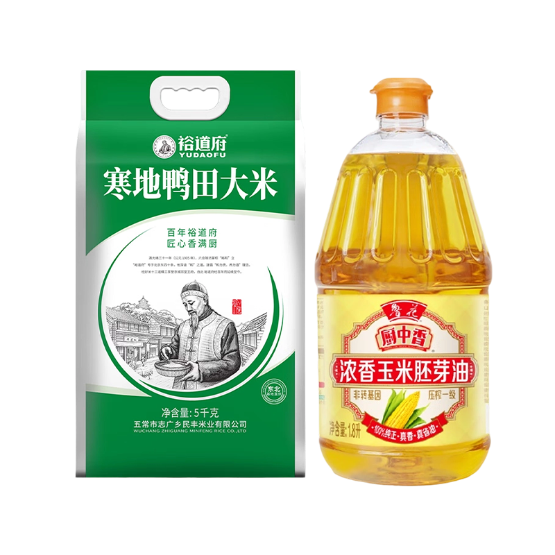 100套餐二(鲁花厨中香浓香玉米胚芽油1.8L+裕道府 寒地鸭田东北大米5kg 米掌柜系列 双层真空包装)