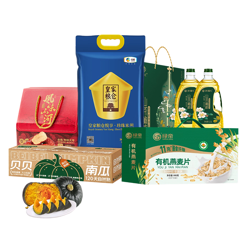 >套餐300B(纳福汇山茶橄榄油礼盒1500ml*2+中粮悦享珍珠米5KG+绿帝 有机燕麦片900g+俏南北-每日和田红枣500g+俏南北 贝贝南瓜礼盒5斤装)