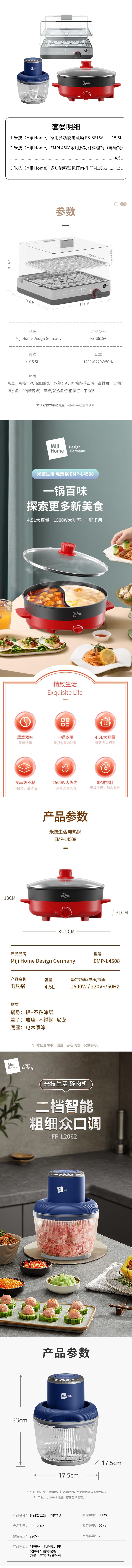 套餐(1000+100)C(米技(Miji Home)家用多功能电蒸箱15.5LFS-S615A+米技(Miji Home)EMPL4508家用多功能料理锅(鸳鸯锅)4.5升+米技(Miji Home)多功能料理机打肉机 2L FP-L2062)