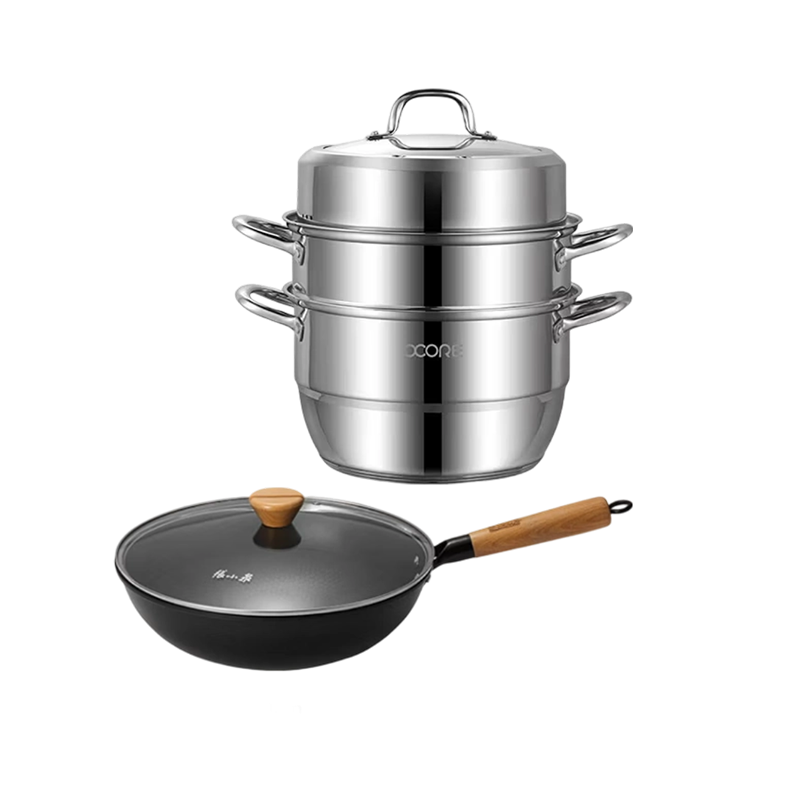 >300套餐(张小泉归朴系列铁锅(带盖)32cm(C33520100)+物芯质造米利MIVI 匠味三层蒸锅30cm)